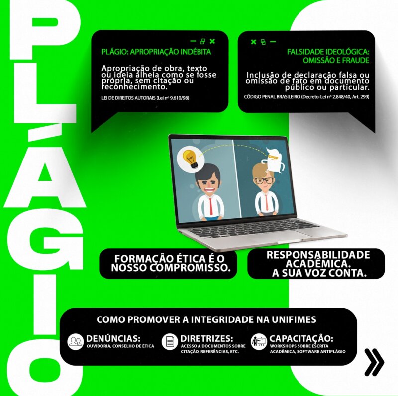 A Pró-reitoria de Ensino, de Pesquisa e de Extensão do Centro Universitário de Mineiros – UNIFIMES reforça à comunidade acadêmica a importância da ética na produção científica e alerta para práticas que violam a integridade acadêmica, como plágio e compra/venda de Trabalhos de Conclusão de Curso (TCC). Essas condutas não apenas prejudicam a credibilidade do estudante e da instituição, como também podem gerar consequências legais e acadêmicas graves.