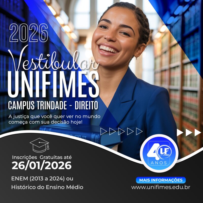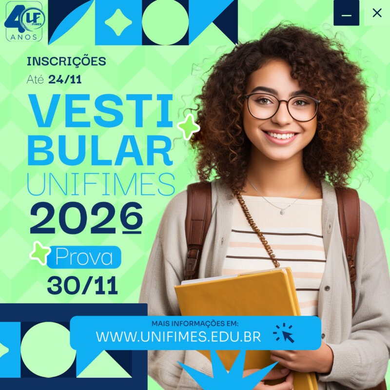 Inscrições: 09/12/25 a 09/01/26 Resultado: 21/01/2026 Dúvidas e informações: vestibular@unifimes.edu.br