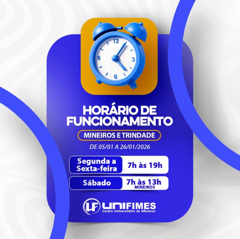 O Centro Universitário de Mineiros – UNIFIMES comunica os horários de funcionamento de suas unidades, a sede Mineiros e o Campus Trindade, durante o período de 05/01/2026 a 26/01/2026.