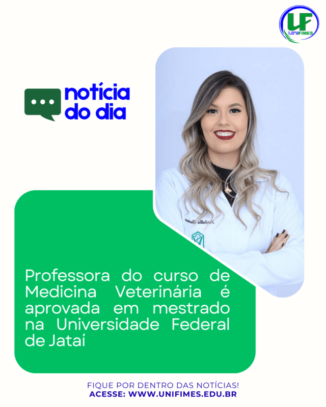 O curso de Medicina Veterinária celebra mais uma importante conquista acadêmica. A Profa. Izabella Ferreira Queiroz foi aprovada no Programa de Mestrado em Biociência Animal e Saúde Única, da Universidade Federal de Jataí (UFJ), com início das atividades previsto para o primeiro semestre de 2026.