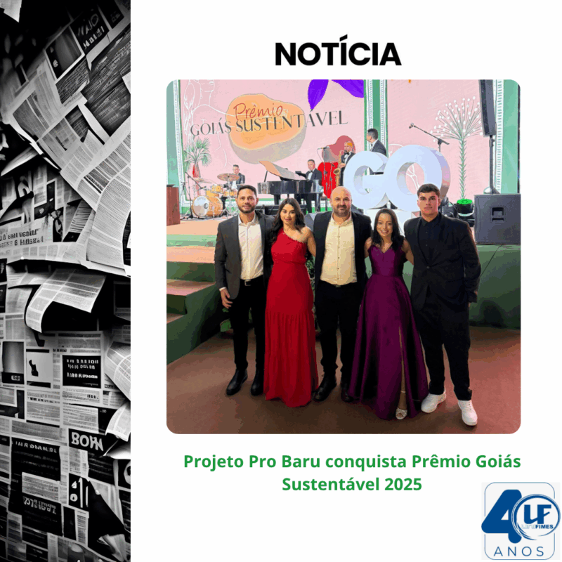 O Projeto Pro Baru, desenvolvido na Unifimes, conquistou o segundo lugar na categoria Sociobiodiversidade do Prêmio Goiás Sustentável 2024, promovido pela Secretaria de Estado de Meio Ambiente e Desenvolvimento Sustentável (SEMAD-GO). A cerimônia de premiação ocorreu no dia 04 de junho de 2025, em Goiânia, como parte da programação da Semana do Meio Ambiente.