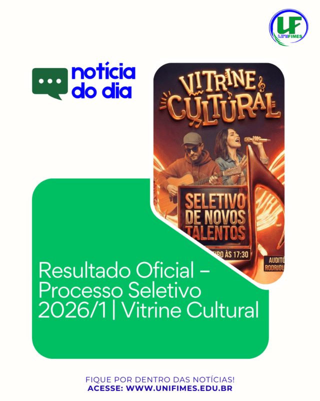 Foi publicado o resultado oficial do Processo Seletivo 2026/1 da Vitrine Cultural, celebrando a aprovação de novos talentos que passarão a integrar as atividades culturais da instituição neste semestre.
