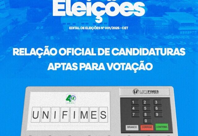 A Comissão Eleitoral Temporária, designada pela Reitoria do Centro Universitário de Mineiros – UNIFIMES, por meio da Portaria nº 008/2025, datada de 27 de março de 2025, tem o prazer de anunciar a divulgação da Relação Oficial de Candidaturas inscritas para os cargos de representantes docente, discente e técnico-administrativo. [...]