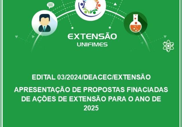 Confira o resultado preliminar das propostas deferidas referente ao EDITAL 03/2024/DEACEC/EXTENSÃO APRESENTAÇÃO DE PROPOSTAS FINANCIADAS DE AÇÕES DE EXTENSÃO PARA O ANO DE 2025. Acesse o link: Edital 03/2024 DEACEC Extensão – PROPOSTAS PARA O ANO DE 2025 – Centro Universitário de Mineiros – UNIFIMES [...]