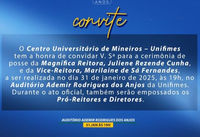 O Centro Universitário de Mineiros – Unifimes convida a todos para a cerimônia de posse da Magnífica Reitora, Juliene Rezende Cunha, e da Vice-Reitora, Marilaine de Sá Fernandes, a ser realizada no dia 31 de janeiro de 2025, às 19h, no Auditório Ademir Rodrigues dos Anjos da Unifimes. Durante [...]