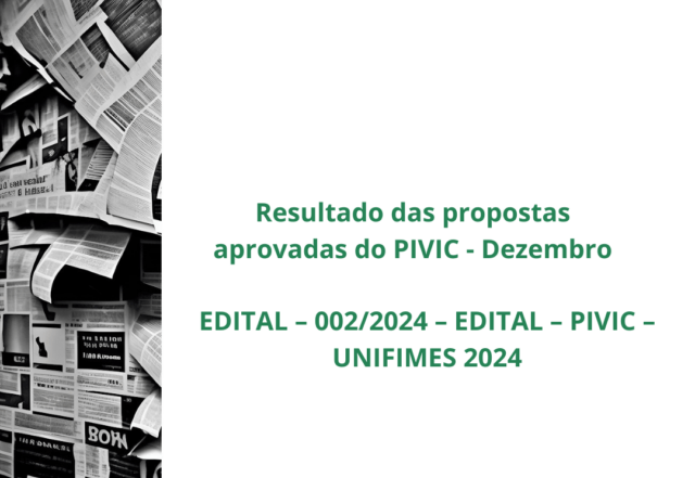 Confira o resultado dos projetos aprovados no âmbito do Edital 002/2024/DIP/PIVIC – Edital PIBIC Unifimes 2024 – Programa Institucional Voluntário de Iniciação Científica (PIVIC). Para acessar o resultado, visite a página de Pesquisa do site da Unifimes (https://unifimes.edu.br/pesquisa/), seguindo o caminho abaixo: * Editais de Pesquisa * 2024 [...]