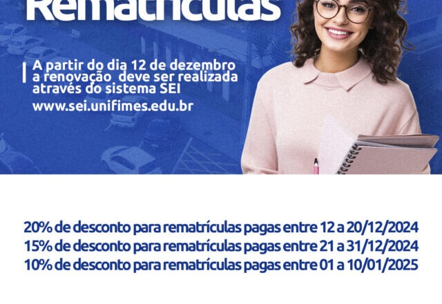 As rematrículas iniciarão a partir do dia 12 de dezembro e a renovação deve ser realizada através do sistema SEI (sei.unifimes.edu.br). Os descontos aplicados obedecerão aos seguintes prazos: 20% (Vinte por Cento) de desconto para rematrículas pagas entre 12 a 20/12/2024; 15% (Quinze por Cento) de desconto para rematrículas [...]