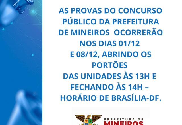As provas do CONCURSO PÚBLICO DA PREFEITURA DE MINEIROS ocorrerão nos dias 01/12 e 08/12, abrindo os portões das unidades às 13h e fechando às 14h – horário de BRASÍLIA-DF. Dia 01/12 (domingo) – Provas para os Cargos de nível fundamental: Administração Geral: Agente de Sinalização Viária; Auxiliar [...]