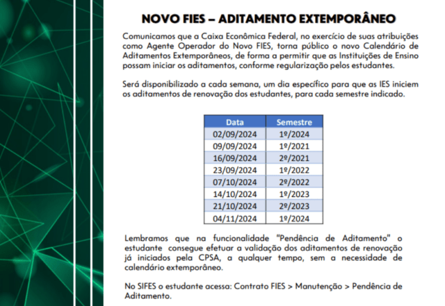 Está aberto o período de aditamentos extemporâneos do Novo FIES. Os aditamentos extemporâneos são destinados aos alunos que estão com a situação do contrato do FIES irregular e desejam regularizar a contratação do financiamento. Em caso de dúvidas, entre em contato com a CPSA através do e-mail: cpsa@unifimes.edu.br
