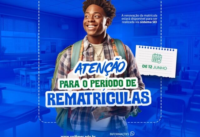 Atenção comunidade acadêmica para o período de rematrículas referente ao 2º semestre de 2024: A renovação da matrícula estará disponível para ser realizada via sistema SEI a partir do dia 12/06/2024. Os descontos aplicados obedecerão aos seguintes prazos: * 15% (Quinze Por Cento) de desconto para rematrículas pagas [...]