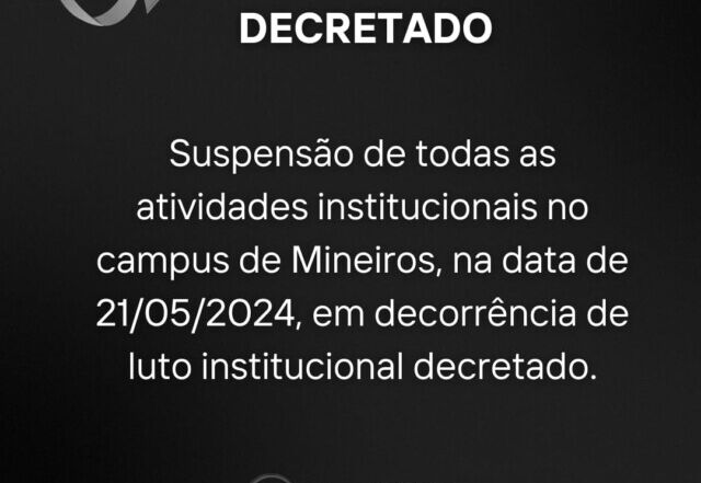 Suspensão de todas as atividades institucionais no campus de Mineiros, na data de 21/05/2024, em decorrência de luto institucional decretado. Em razão do falecimento do servidor Geraldo Eustáquio da Costa Júnior, pertencente ao quadro de docentes efetivos do curso de Medicina da UNIFIMES, cuja lotação era no campus de [...]