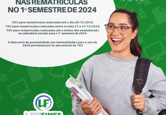 Atenção acadêmicos para os DESCONTOS NA REMATRÍCULA PARA O 1º SEMESTRE DE 2024: * 20% para rematrículas realizadas até o dia 20/12/2023; * 15% para rematrículas realizadas entre os dias 21 a 31/12/2023; * 10% para rematrículas realizadas até o último dia estabelecido no calendário escolar para o 1º [...]