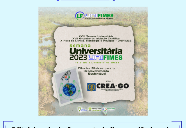 O Centro Universitário de Mineiros – UNIFIMES, através da Diretoria de Pesquisa (DIP) e Diretoria de Extensão, Assuntos Comunitários, Estudantis e Culturais (DEACEC) torna pública a abertura das submissões e estabelece normas relativas à participação e publicação de trabalhos acadêmicos na XVIII Semana Universitária, XVII Encontro de Iniciação Científica [...]