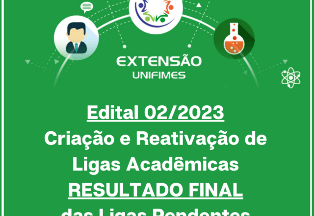 A Diretoria de Extensão, Assuntos Comunitários, Estudantis e Culturais – DEACEC da UNIFIMES publicou nesta segunda-feira, 18 de setembro de 2023, o Resultado FINAL do Edital 02/2023/DEACEC/EXTENSÃO – Apresentação de Propostas de Criação e Reativação de Ligas Acadêmicas dos Cursos de Graduação, após análise dos documentos pendentes. O Resultado [...]