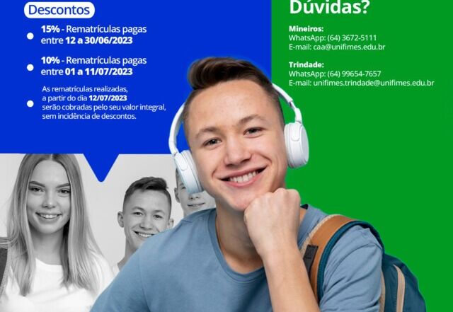 Atenção acadêmicos, a renovação da matrícula estará disponível para ser realizada via sistema SEI a partir do dia 12/06/2023. Os descontos aplicados obedecerão aos seguintes prazos: * 15% (Quinze Por Cento) de desconto para rematrículas pagas entre 12 a 30/06/2023; * 10% (Dez Por Cento) de desconto para rematrículas pagas entre 01 [...]