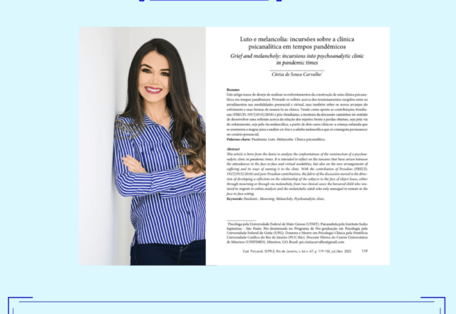 A professora Dra. Cíntia de Sousa Carvalho, dos cursos de Psicologia e Medicina da UNIFIMES, publicou o artigo “Luto e melancolia: incursões sobre a clínica psicanalítica em tempos pandêmicos”, na revista do Círculo Psicanalítico do Rio de Janeiro: “Cadernos de Psicanálise” (CPRJ). O artigo nasceu do desejo de analisar [...]