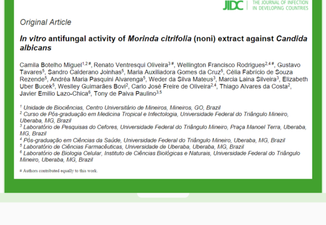 O estudo intitulado “In vitro antifungal activity of Morinda citrifolia (noni) extract against Candida albicans” foi desenvolvido por grupo de pesquisadores da Universidade Federal do Triângulo Mineiro, Universidade de Uberaba e contou com a colaboração de Pesquisadores do Centro Universitário de Mineiros, Dra. Camila Botelho Miguel e Dr. Wellington [...]