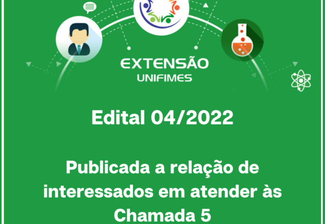 A Diretoria de Extensão, Assuntos Comunitários, Estudantis e Culturais (DEACEC) torna pública a relação de interessados(as) em apresentar projetos que atendam demandas recebidas da sociedade, no âmbito da Chamada 5 do Edital 04/2022/DEACEC/EXTENSÃO. A DEACEC entrará em contato com os(as) docentes e servidores interessados(as) para agendar reuniões junto [...]