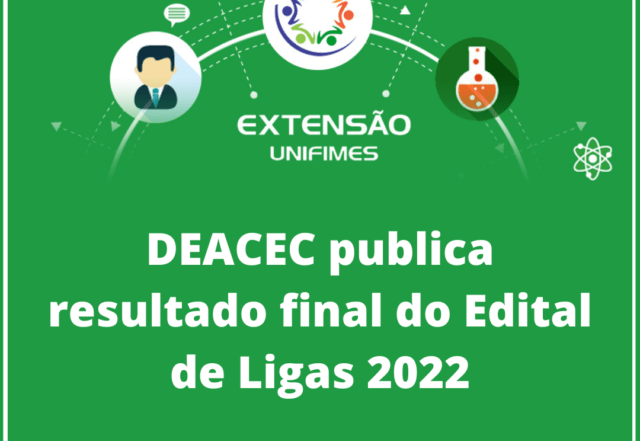 A Diretoria de Extensão, Assuntos Comunitários, Estudantis e Culturais da UNIFIMES publicou o resultado final das avaliações das propostas de criação, revalidação e reativação de ligas acadêmicas submetidas ao Edital 03/2022/DEACEC/EXTENSÃO. O resultado pode ser conferido na página do Edital, através do link: https://unifimes.edu.br/2022/05/03/edital-03-2022-deacec-extensao