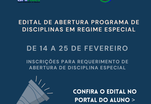 Estará aberto, de 14 a 25 de fevereiro, as inscrições de requerimento de abertura disciplina especial junto a coordenação de curso. O Programa é oferecido semestralmente de maneira concomitante com as atividades acadêmicas previstas no Calendário Letivo em Curso. Para o primeiro semestre do decorrente ano letivo as aulas [...]