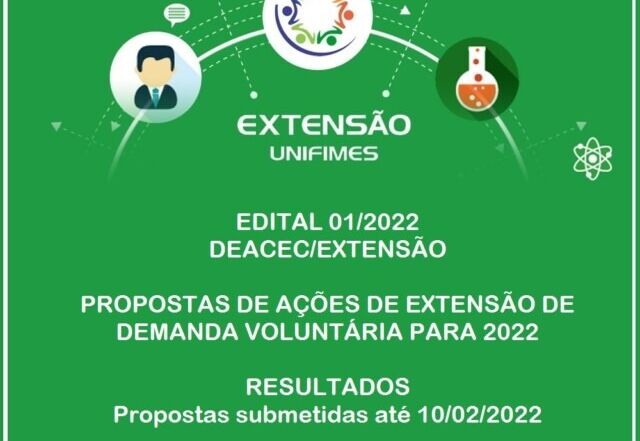 A Diretoria de Extensão publicou o resultado do Edital 01/2022DEACEC/EXTENSÃO APRESENTAÇÃO DE PROPOSTAS DE AÇÕES DE EXTENSÃO DE DEMANDA VOLUNTÁRIA PARA O ANO DE 2022. Confira: Resultado 01 – propostas submetidas até 10 de fevereiro