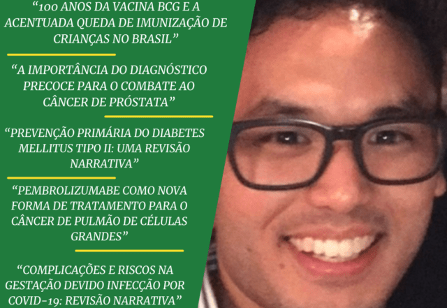 O graduando Alex Yukio Nishiyama, do 2º período do curso de medicina da UNIFIMES, apresentou no formato pôster os resumos simples intitulados: "COMORBIDADES ASSOCIADAS AO ISOLAMENTO SOCIAL NA PANDEMIA DO COVID-19: REVISÃO NARRATIVA"; "A IMPORTÂNCIA DO DIAGNÓSTICO PRECOCE PARA O COMBATE AO CÂNCER DE PRÓSTATA"; "100 ANOS DA VACINA [...]