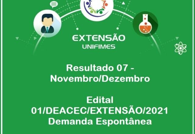 A Diretoria de Extensão divulga resultado das propostas aprovadas de ações de extensão de demanda espontânea – Novembro/Dezembro de 2021, referente ao Edital 01/DEACEC/EXTENSÃO/2021. O documento está disponível no site da UNIFIMES, na página da Extensão em Editais de Extensão/EDITAL 01/DEACEC/EXTENSÃO/2021 – Resultado 07 - novembro-dezembro.
