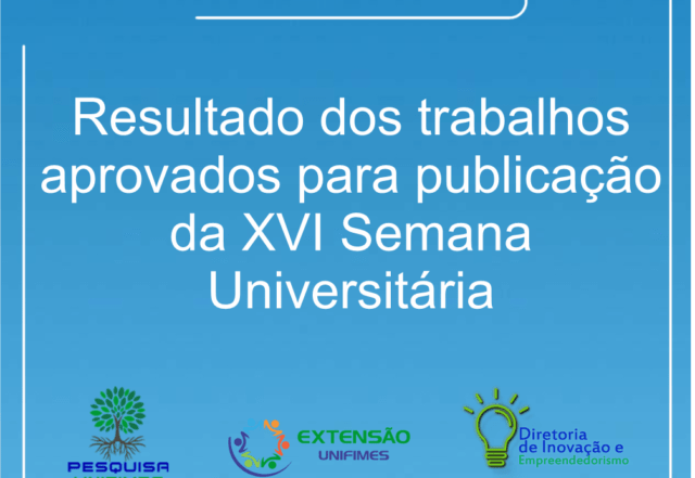 A comissão organizadora da XVI Semana Universitária, XV Encontro de Iniciação Científica e VIII Feira de Ciência, Tecnologia e Inovação da UNIFIMES, por meio de suas atribuições torna público o resultado dos trabalhos aprovados para publicação. A lista com a relação dos trabalhos aprovados encontra-se disponível na página [...]