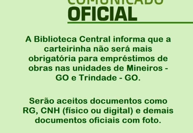 A Biblioteca Central informa que a carteirinha não será mais obrigatória para empréstimos de obras nas unidades de Mineiros - GO e Trindade - GO. Serão aceitos documentos como RG, CNH (físico ou digital) e demais documentos oficiais com foto.
