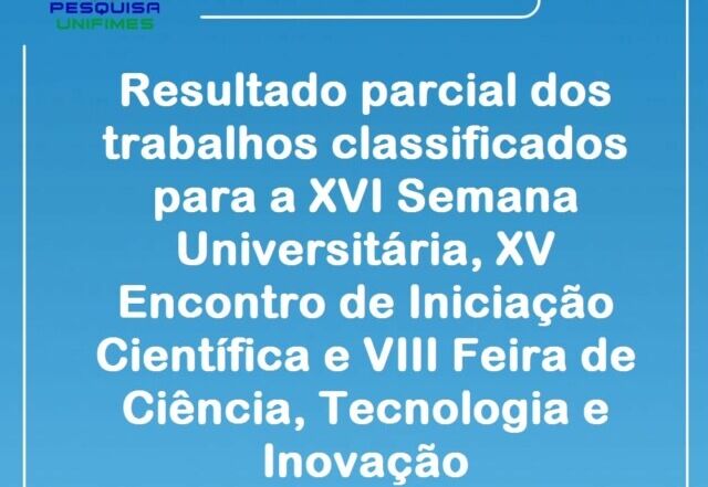 Foi publicado o resultado parcial dos trabalhos classificados para a XVI Semana Universitária, XV Encontro de Iniciação Científica e VIII Feira de Ciência, Tecnologia e Inovação da UNIFIMES. O resultado pode ser acessado na página do evento, no Menu Inscrições.