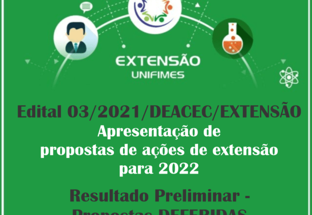 A Diretoria de Extensão divulga o resultado preliminar referente ao Edital 03/2021/DEACEC/EXTENSÃO, que trata sobre a Apresentação de propostas de ações de extensão para o ano de 2022. O resultado pode ser acessado na página da Extensão no site www.unifimes.edu.br, em Editais de Extensão/Edital 03/2021/DEACEC/Extensão - Apresentação de propostas [...]