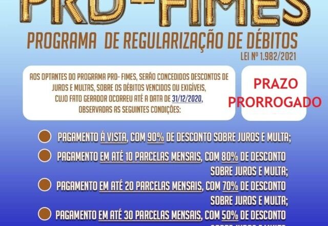 O Centro Universitário de Mineiros – UNIFIMES informa que foi prorrogado por mais 120 dias o prazo do Programa de Regularização de Débitos – PRD/FIMES – Lei nº 1.982/2021. Aos optantes do Programa PRD-FIMES, serão concedidos descontos de juros e multas, sobre os débitos vencidos ou exigíveis, cujo fato gerador [...]