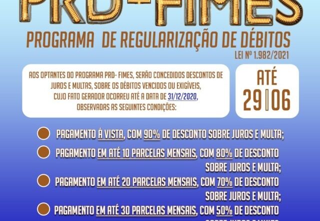 O Centro Universitário de Mineiros - UNIFIMES, informa que o Programa de Regularização de Débitos – PRD/FIMES – Lei nº 1.982/2021, terá vigência até o dia 29/06/2021. Aos optantes do Programa PRD-FIMES, serão concedidos descontos de juros e multas, sobre os débitos vencidos ou exigíveis, cujo fato gerador ocorreu até [...]