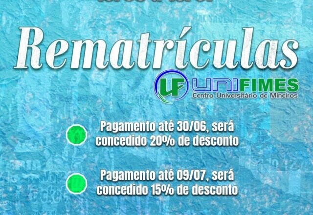 A Central de Atendimento ao Aluno da UNIFIMES, vem através deste informar a toda comunidade acadêmica que inicia hoje (10/06) o período para a rematrícula referente ao semestre 2021/2 para os alunos veteranos. O prazo se estenderá até o dia 16/07/2021. Confira os planos de descontos: Para pagamento [...]