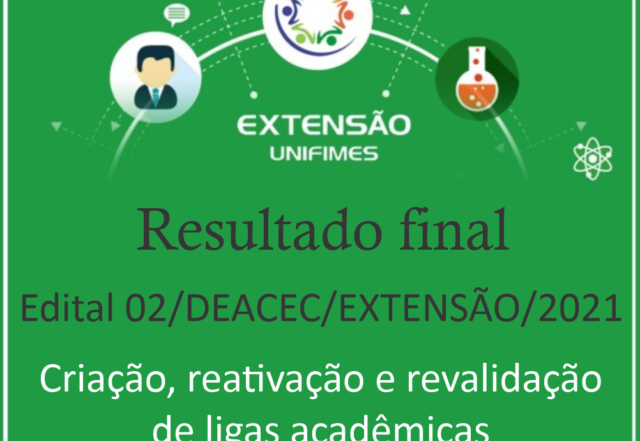A Diretoria de Extensão através do seu diretor prof. Me. Zaqueu Henrique de Souza, divulga o resultado final do Edital 02/DEACEC/EXTENSÃO/2021 referente a Propostas de Criação de Ligas Acadêmicas dos Cursos de Graduação. O documento está disponível no site da UNIFIMES, na página da Extensão em Editais de Extensão [...]