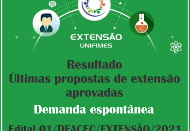 A Diretoria de Extensão através do seu diretor prof. Me. Zaqueu Henrique de Souza, divulga resultado das propostas aprovadas de ações de extensão de demanda espontânea - Agosto 2021, referente ao Edital 01/DEACEC/EXTENSÃO/2021. O documento está disponível no site da UNIFIMES, na página da Extensão em Editais de Extensão/EDITAL [...]