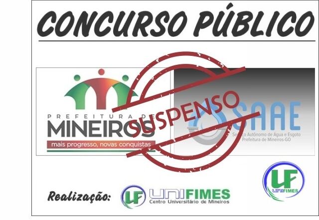 A Comissão Organizadora do Concurso Público 01/2020 e o Município de Mineiros, comunicam a todos, em especial aos inscritos, que o certame foi suspenso, em decorrência de decisão judicial proferida nos autos nº 5622281-62.2020.8.09.0105 que tramitam perante a Vara das Fazendas Públicas da Comarca de Mineiros. ⠀ De acordo [...]