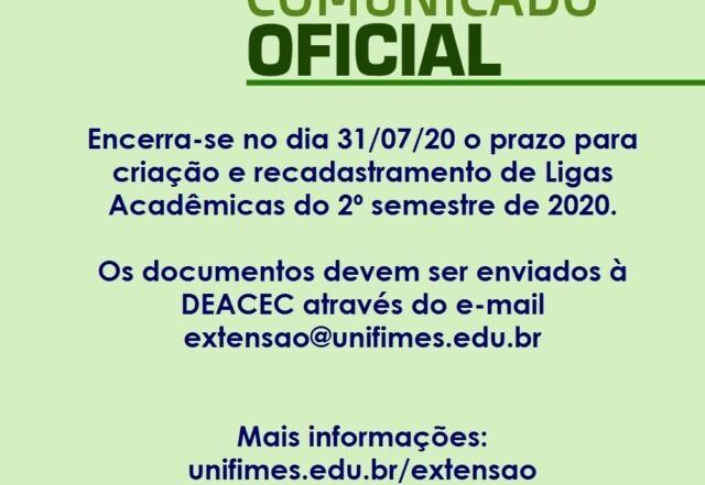 Encerra-se no dia 31/07/20 o prazo para criação e recadastramento de Ligas Acadêmicas do 2º semestre de 2020. Os documentos exigidos para criar ou recadastrar as ligas acadêmicas que pretendam ter início ou permanecer ativas em 2020/2 deverão ser enviados à Diretoria de Extensão, Assuntos Comunitários, Estudantis e Culturais [...]