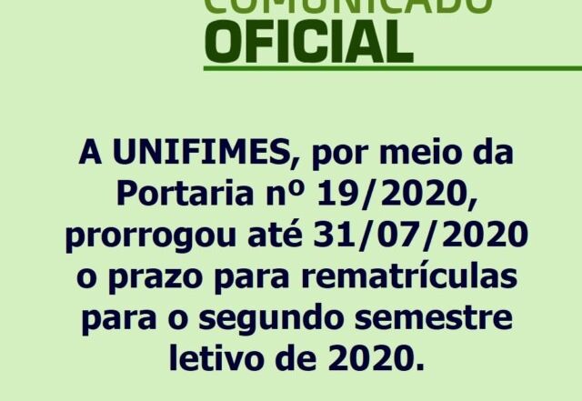 A UNIFIMES, por meio da Portaria nº 19/2020, prorrogou até 31/07/2020 o prazo para a realização de rematrículas referentes ao segundo semestre letivo de 2020. - A rematrícula de acadêmicos adimplentes será realizada sem acréscimos; - A rematrícula de acadêmicos inadimplentes será realizada também sem acréscimos, logo após a [...]