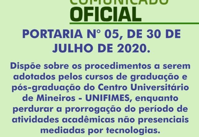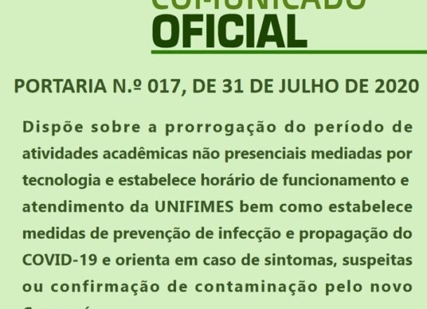 A PORTARIA N.º 017 revoga o Decreto Fundacional nº 197 de 23 de Abril de 2020 e dispõe sobre a prorrogação do período de atividades acadêmicas não presenciais mediadas por tecnologia e fixa o horário de funcionamento e atendimento da UNIFIMES; também estabelece medidas de prevenção de infecção e [...]