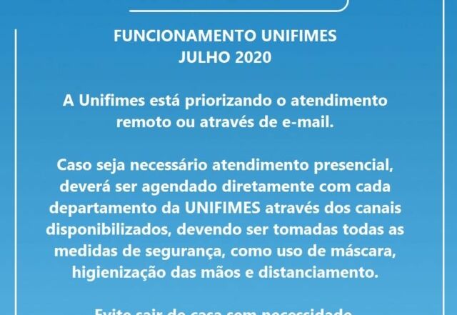 Visando a segurança de seus colaboradores e de todo o público em geral a Unifimes está priorizando o atendimento remoto ou através de e-mail. Caso seja necessário atendimento presencial ele deverá ser agendado diretamente com o departamento através de um dos canais disponibilizados e devem ser tomadas todas as [...]