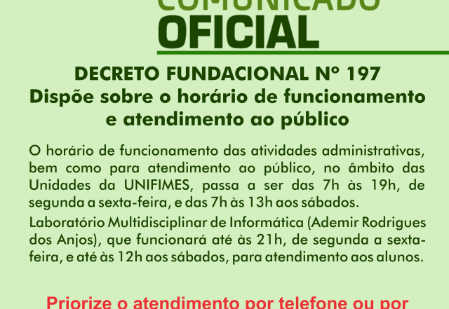 Decreto Fundacional 197/2020 determina novos horários de funcionamento administrativo e atendimento ao público da Unifimes