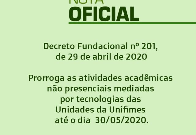 O Decreto Fundacional nº 201 da Unifimes decreta a prorrogação das atividades acadêmicas não presenciais mediadas por tecnologia das Unidades UNIFIMES até 30/05/2020. O Decreto considera o estado de emergência diante do novo Coronavírus (COVID19) e decretos da Prefeitura Municipal de Mineiros, Governo do Estado de Goiás e instâncias [...]