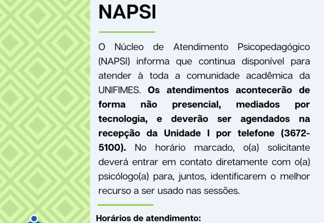 O Núcleo de Atendimento Psicopedagógico - NAPSI informa que continua disponível para atender à toda a comunidade acadêmica da UNIFIMES. Os atendimentos acontecerão de forma não presencial, mediados por tecnologia, e deverão ser agendados na recepção da Unidade I através do telefone (64) 3672-5100, de segunda à sexta-feira das [...]