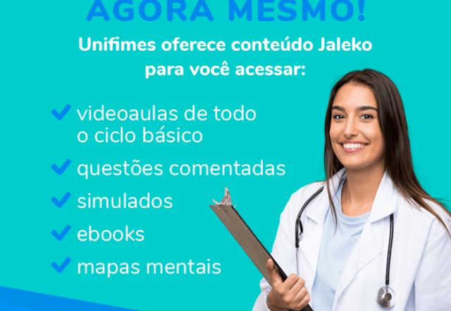 A plataforma de ensino Jaleko disponibilizou de forma gratuita o primeiro ciclo básico para os alunos calouros de Medicina 2020 da Unifimes, das unidades de Mineiros e Trindade. Os calouros de 2020 receberão um e-mail da Jaleko com link e senha para acesso. Dúvidas e informações: (64) 3672-5123