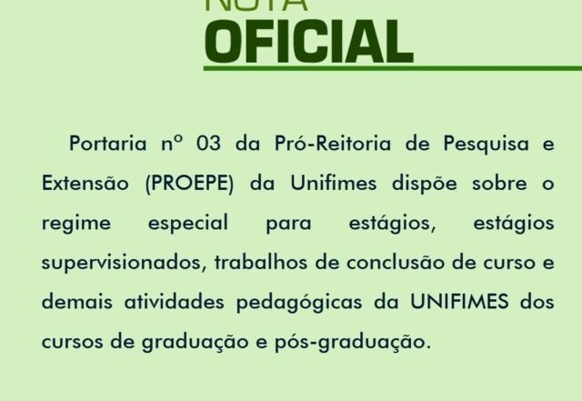 A Portaria nº 03 da Pró-Reitoria de Pesquisa e Extensão (PROEPE) da Unifimes dispõe sobre o regime especial para estágios, estágios supervisionados, trabalhos de conclusão de curso e demais atividades pedagógicas da UNIFIMES dos cursos de graduação e pós-graduação: - Trabalhos, links, vídeos, atividades e outros materiais encaminhados [...]