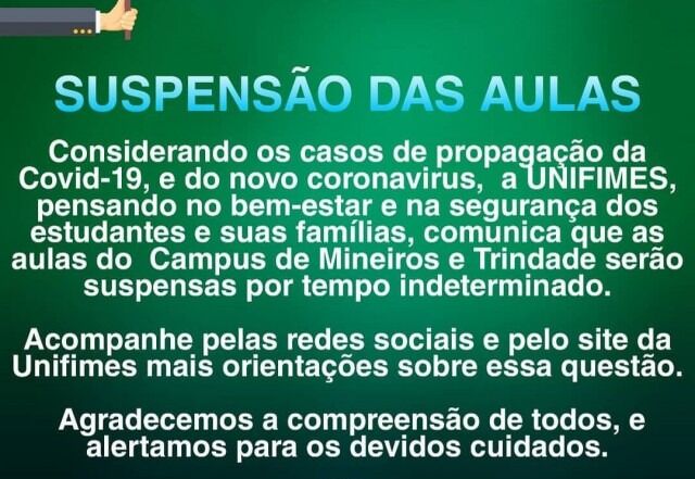 Considerando os casos de propagação da "Covid19", o novo coronavirus, a UNIFIMES, pensando no bem-estar e na segurança dos estudantes e suas famílias, comunica que as aulas do Campus de Mineiros e Trindade serão suspensas por tempo indeterminado. Exceto estudantes que estão no internato. Acompanhe pelas redes sociais e [...]
