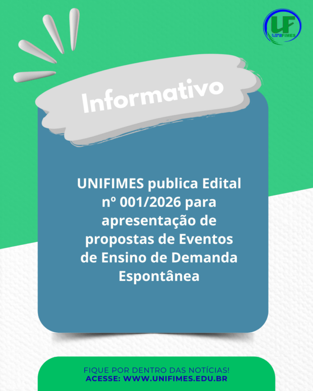 A Pró-Reitoria de Ensino, de Pesquisa e de Extensão (PROEPE), por meio da Diretoria de Ensino (DEN), do Centro Universitário de Mineiros – UNIFIMES, torna público o Edital/DEN/PROEPE/UNIFIMES nº 001/2026, que dispõe sobre a apresentação de propostas de Eventos de Ensino de Demanda Espontânea para o ano de 2026.