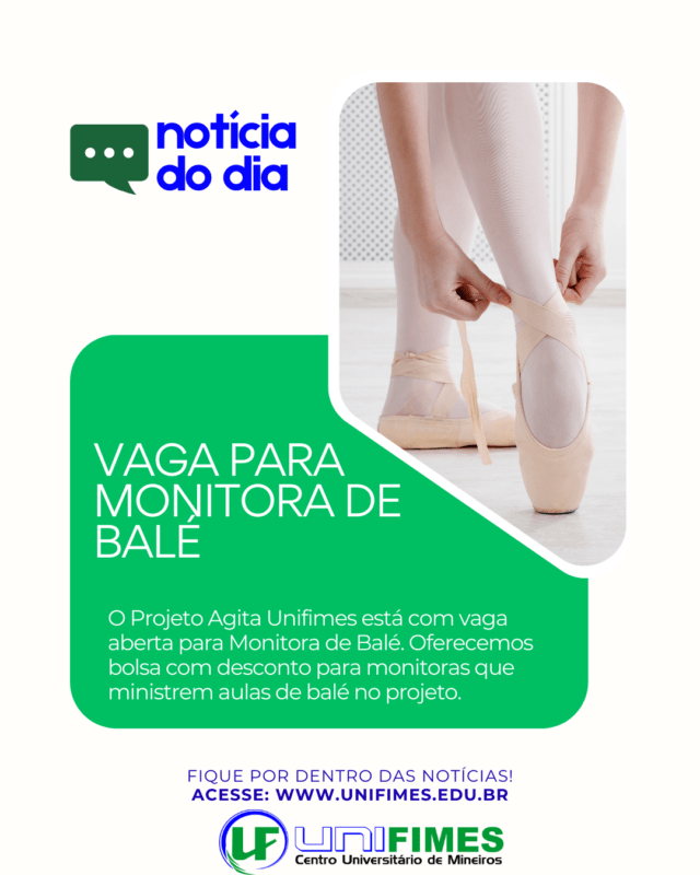 O Projeto Agita UNIFIMES está com oportunidade aberta para Monitora de Balé. A iniciativa oferece bolsa com desconto para candidatas que desejam atuar ministrando aulas e contribuindo com a promoção da cultura, arte e qualidade de vida por meio da dança.